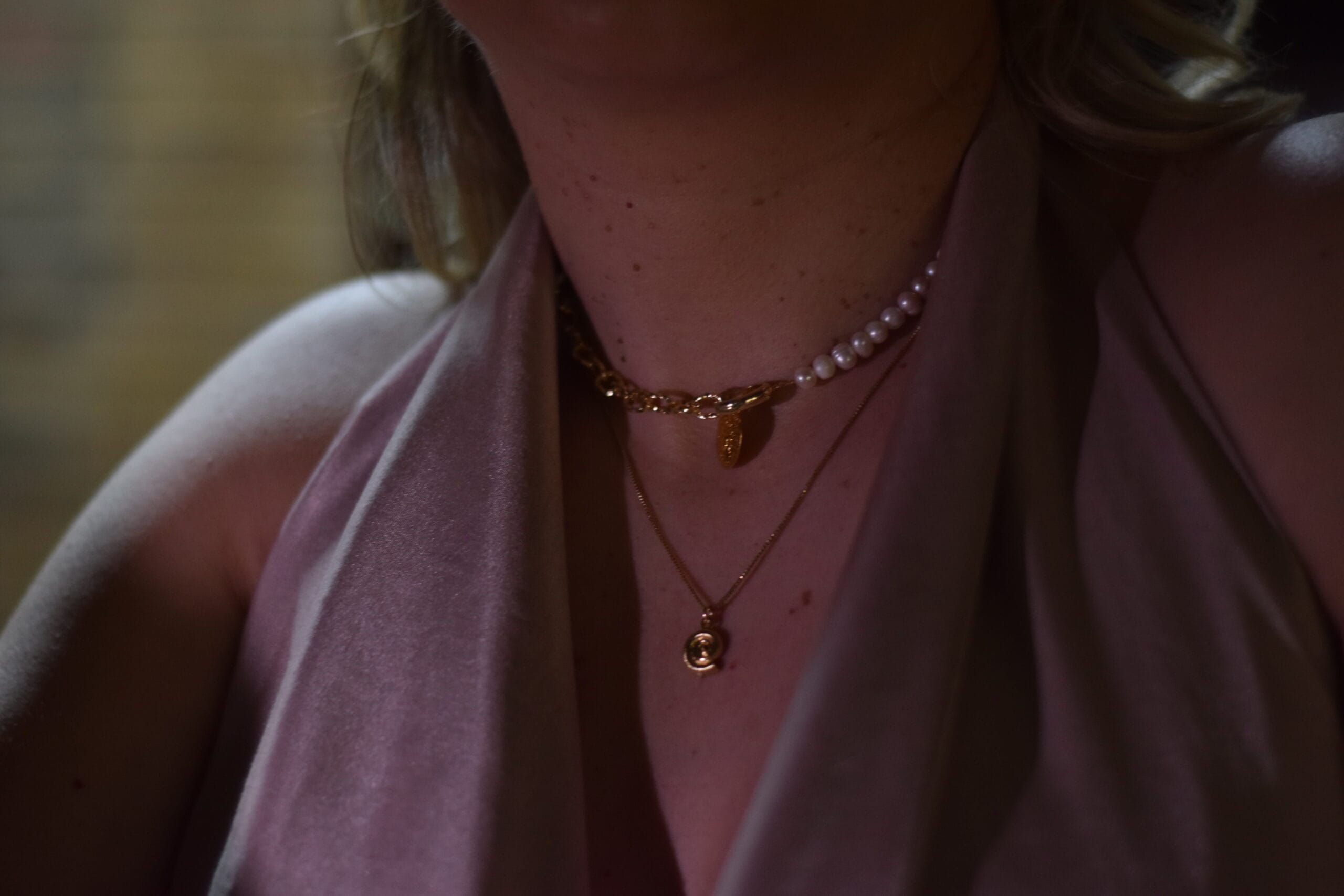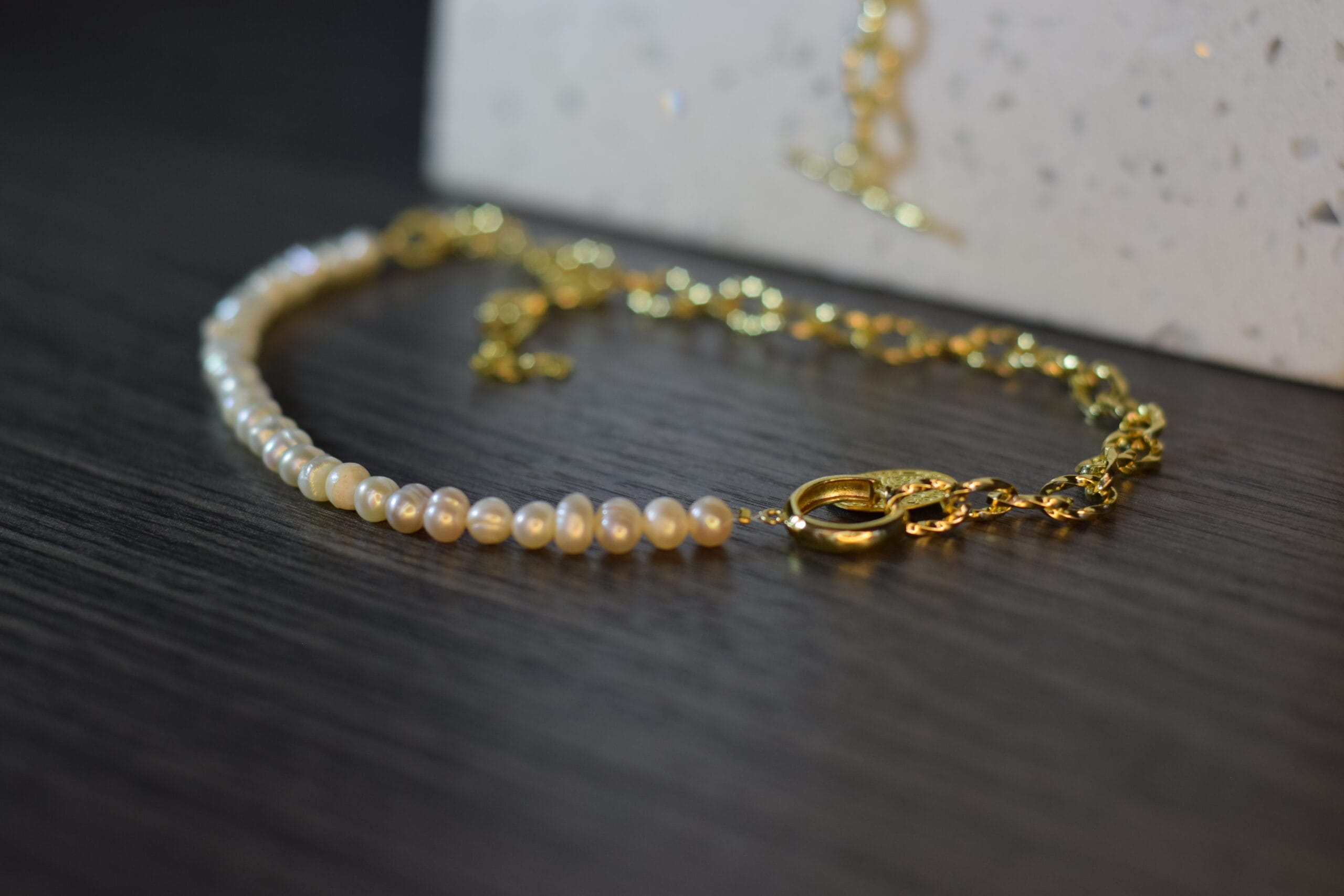 - Collar fabricado a mano en rodio con baño de oro de 24 K y perlas naturales
